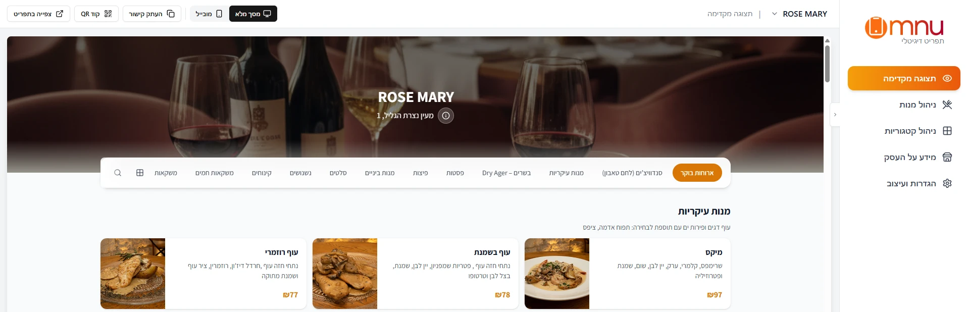 mnu היא פלטפורמה לניהול תפריט דיגיטלי חכם, עם שליטה מלאה, עדכונים מהירים וחוויית שימוש פשוטה. פתרון מתקדם, נוח ומשתלם לעסקים בעולם דיגיטלי.